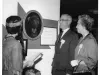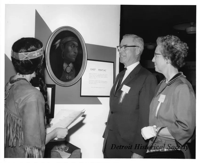 Black and white photographic print of Mrs. Glenn Stille dressed as a Native American, with guests Mr. and Mrs. James Beresford, viewing an exhibit on Chief Pontiac, at the reception for the 200th Anniversary of the Pontiac Uprising, May 7, 1963.