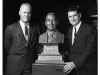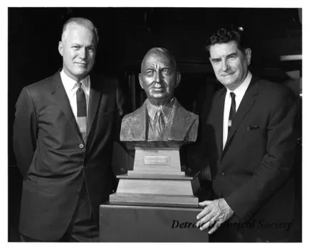 Black and white photographic print of the presentation ceremonies of the bust of Walter P. Chrysler to the Detroit Historical Museum. Standing on the left side of the bust if H. Richard Steding III, Chrysler Corporation Engineering and Vice-President of the Detroit Historical Society, and standing right of the bust of Henry Brown, Museum Director.