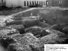 Black and white photographic print of the excavation work and footing placements for the Kresge addition of the Detroit Historical Museum, looking southeast; Kirby Street and the Detroit Public Library are visible in the background. Typed on the bottom right corner of the recto, "City of Detroit Contract DHC-14, Kresge Addn. - Detroit Historical Museum, Barton-Malow Company, Contr. Descr. View of Footing Excav. Looking N.W. Over Under Pin. No. 9, Date: 11-14-66, Win Brunner, Photographer."
