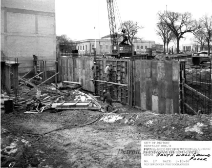 Black and white photographic print of the on-going Kresge addition construction of the south wall adjacent to the already existing building at the Detroit Historical Museum; Kirby Street is visible on the opposing side of the wall construction. Construction workers are visible in the excavated area working on the poured concrete wall. The Detroit Institute of Arts is visible in the right background. Typed on the bottom right corner of the recto, "City of Detroit Contract DHC-14, Kresge Addn. - Detroit Historical Museum, Barton-Malow Company, Contr. Descr. South Wall Ground Floor. No. 17, Date: 1-10-67, Win Brunner, Photographer."