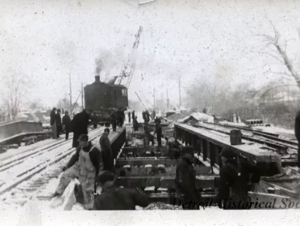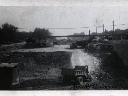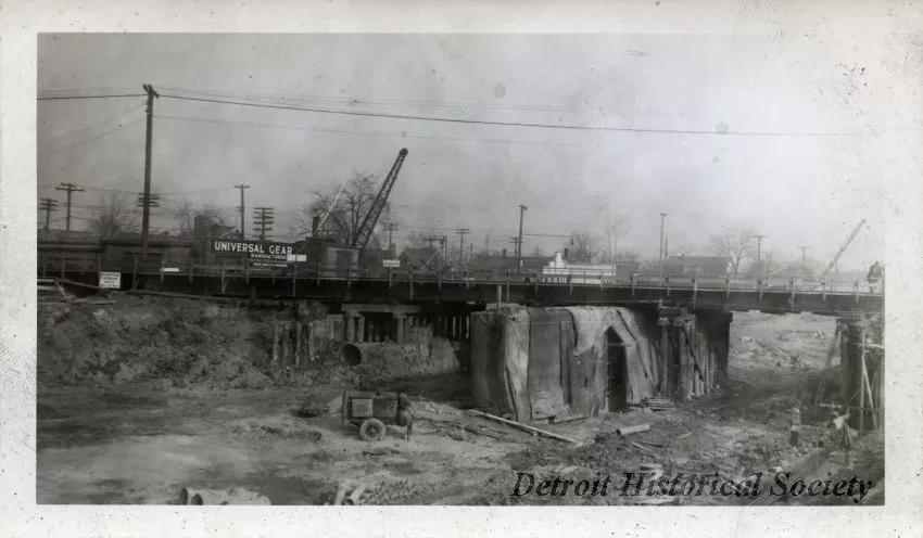 Photograph. Black and white photo of a road and railroad grade separation project. The view looks northeastward and shows the excavation of East McNichols Road in the foreground with the Grand Trunk Railroad line running across the center of the photo. It appears that the existing railroad line is being supported by groups of temporary timber pilings while new concrete bridge piers are being constructed as seen in the center right area of the photo. The Universal Gear factory building (located on E. McNichols Road at Russell Street) can be seen in the left background.