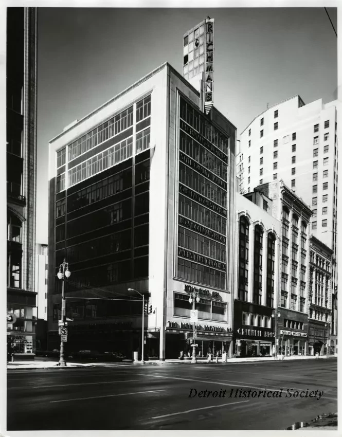 Black and white photograph of the Richman Brothers clothing store at 1505 Woodward Avenue, looking northwest from Clifford Street. To the right are the Grinnell Bros store and Bond Clothes. In the background is the Whitney Building.
