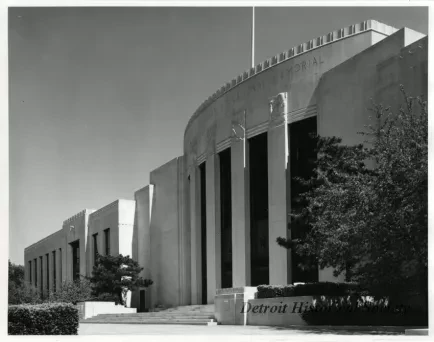 Black and white photograph of the front of the Horace H. Rackham Educational Memorial Building on the south side of Farnsworth Street, looking southeast. The reliefs above the entrance were sculpted by Marshall Fredericks.