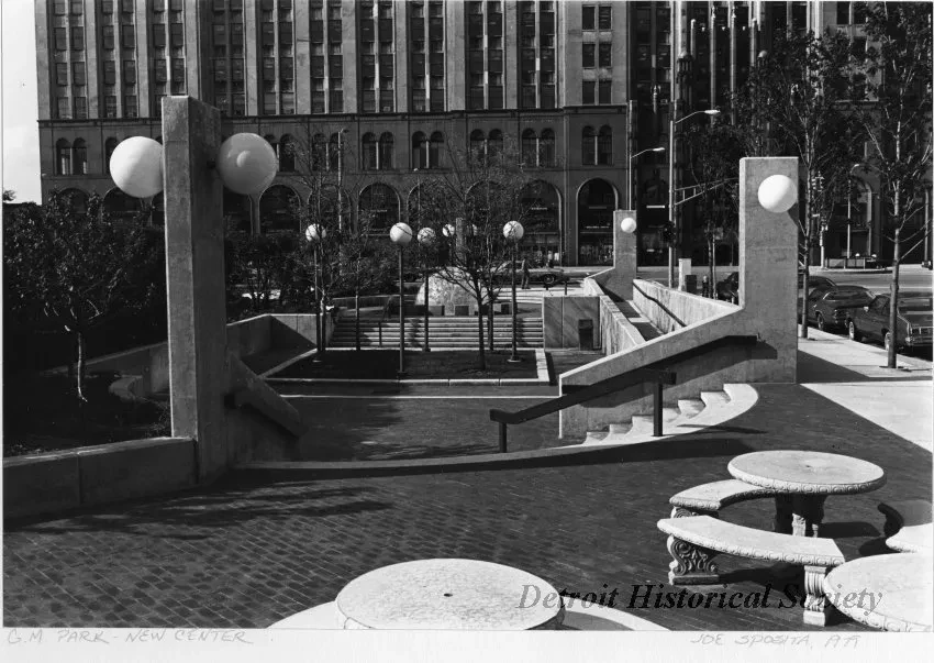 Black and white photographic print mounted on board depicting New Center Park, with a fountain and the Fisher Building in the background. Cement picnic benches are in the front of the photograph. Stairs lead down to the fountain and large light fixtures stand on either side of the stairs and in the middle.