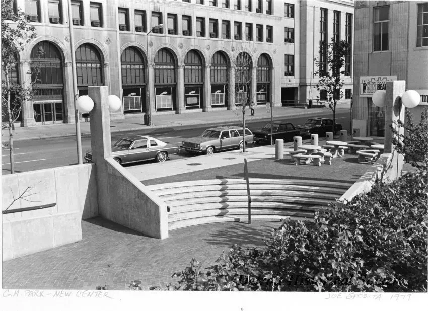 Black and white photographic print mounted on board depicting New Center Park, with the General Motors Building in the background and parked cars along 2nd Avenue. Cement picnic benches are to the right of the photograph. Stairs lead down to a brick floor while large light fixtures stand on either side. A sign on the building to the right reads "Detroit Police Mini Beats".