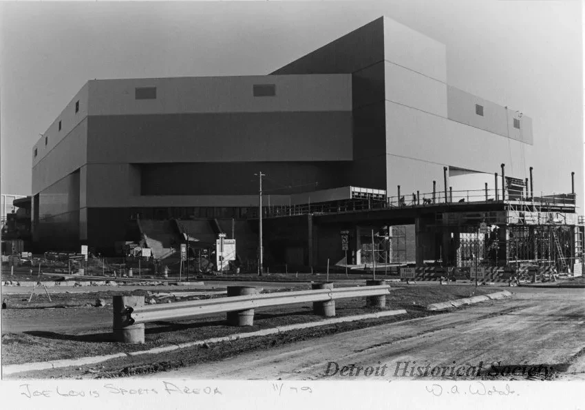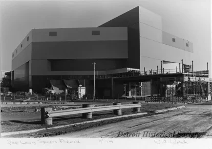 Black and white photographic print mounted on board depicting construction outside of Joe Louis Arena, with a guardrail in the foreground.