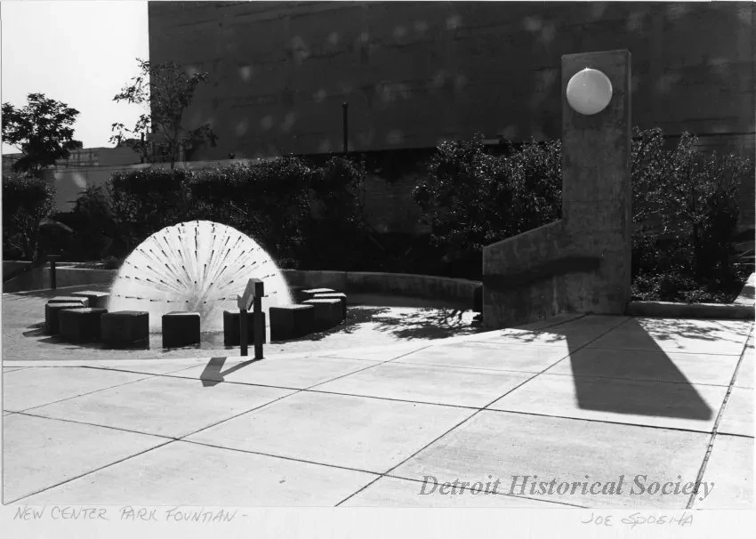 Black and white photographic print mounted on board depicting a hemispherical fountain in New Center Park, with the blank side of a building in the background.