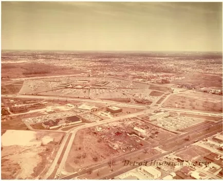 Color photograph showing an aerial view of the Northland Center, looking northeast from the intersection of 8 Mile Road and Northland Drive in Southfield. Also in view is the Reynolds Metals Regional Sales Office. In the background is Oak Park. In the foreground is a motel. Mounted on board.
