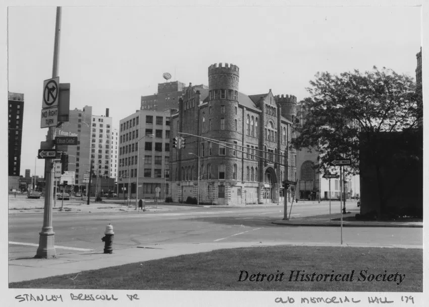 Black and white photographic print mounted on board depicting the G.A.R. Building, looking east from the intersection of 1st Street and Grand River Avenue. The Michigan Building, 1922 Cass Avenue, and The Parks Apartments can be seen in the background. A street sign to the left reads, "Edison Center." A sign on a rooftop reads "AAA".