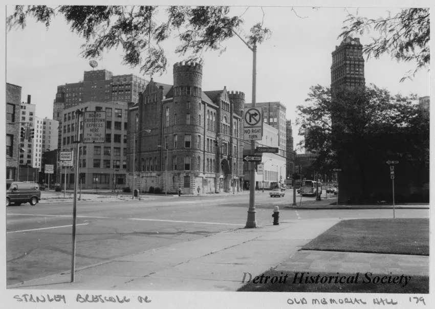 Black and white photographic print mounted on board depicting the G.A.R. Building, looking east from the intersection of 1st Street and Grand River Avenue. 1922 Cass Avenue, a AAA sign, Michigan Building, and Book Tower can be seen in the background. A crosstown express bus stop sign can be seen in the left foreground.