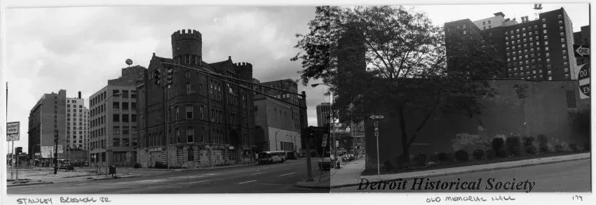 Two black and white photographic prints mounted on board depicting the G.A.R. Building looking east from the intersection of 1st Street and Grand River Avenue. Buildings partially visible in the background include 1922 Cass Avenue, the Michigan Building and the Leland. The Book Tower is obscured by a tree near the center of the photograph. Signs read "Allright Parking" and "AAA".