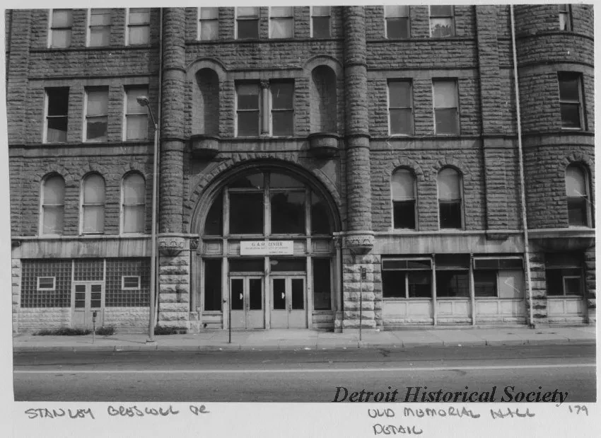 Black and white photographic print mounted on board depicting the Grand River Avenue entrance to the G.A.R. Building. A sign above the door reads, "G.A.R. Center, Recreation Dept., City of Detroit, Coleman A. Young, Mayor."
