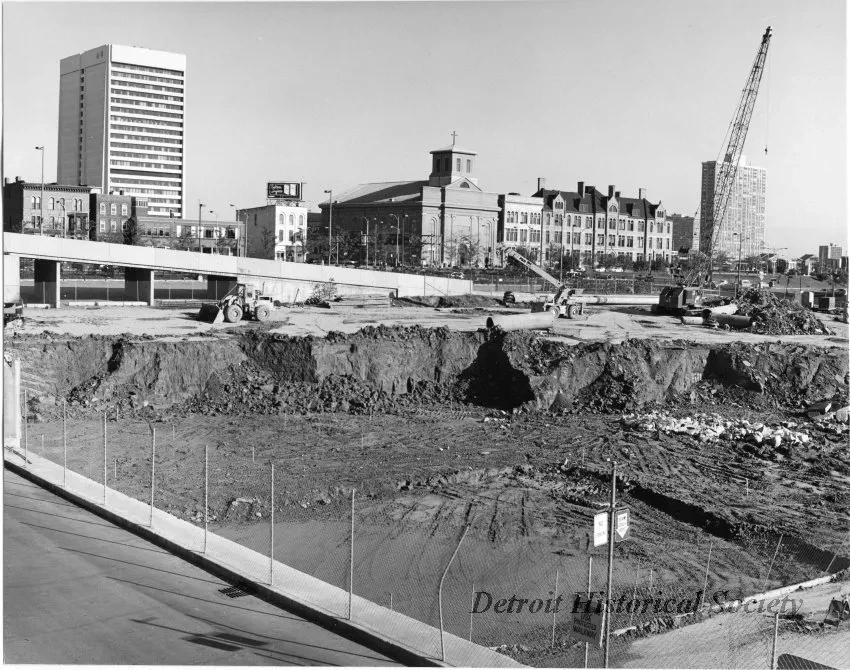 Black and white photographic print mounted on board depicting construction of Phase II of the Renaissance Center. In the background are the Blue Cross Blue Shield Building, Ss. Peter and Paul Jesuit Church, Lafayette Towers, and 1300 Lafayette East. A construction crane can be seen in the right of the background and a ramp to the left. A large hole in the ground is in the foreground surrounded by a fence with a sign that reads "Pedestrians Use Protected Walkway". Other construction equipment can be seen behind the hole. Dated October,1979.