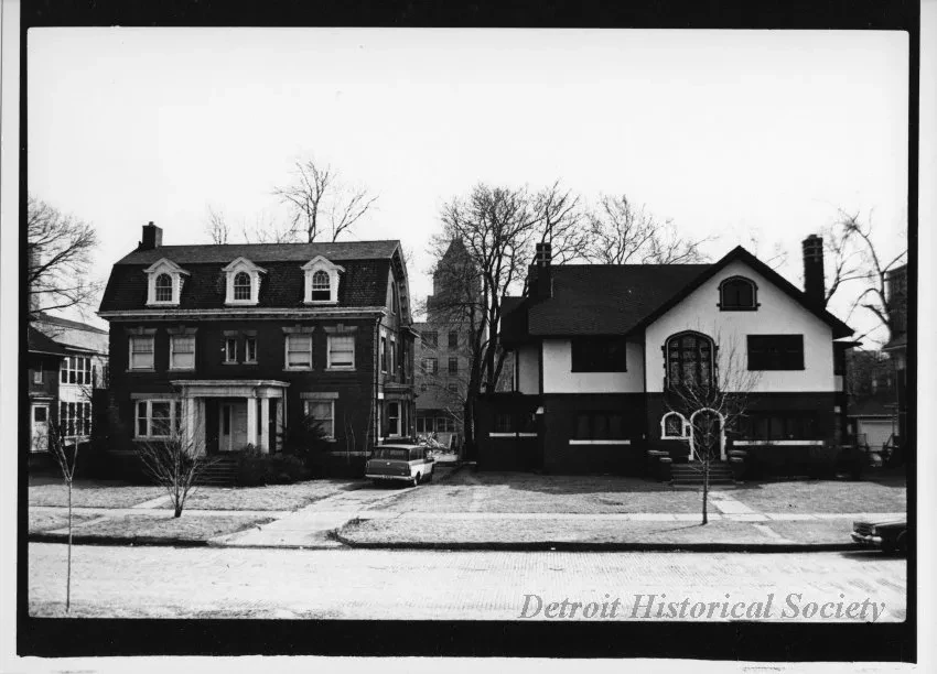 Black and white photographic print mounted on board depicting three-story houses on the south side of Virginia Park Street, with the Fisher Building in the background. Two parked cars are in view. The brick street is in the foreground. Dated April 15th, 1980.
