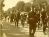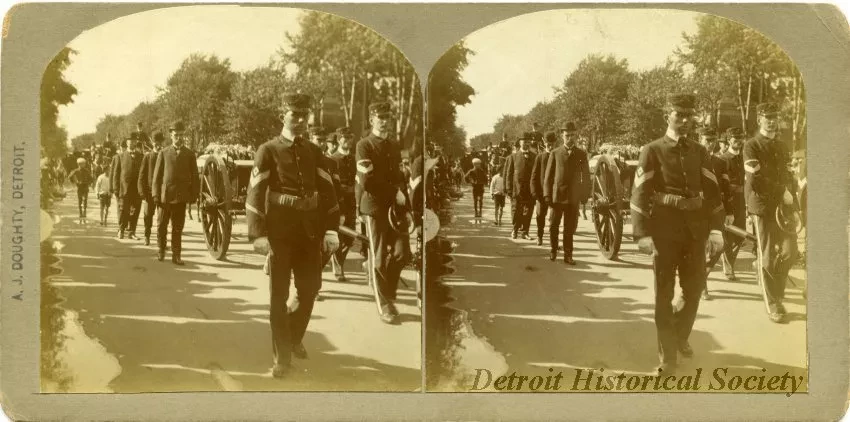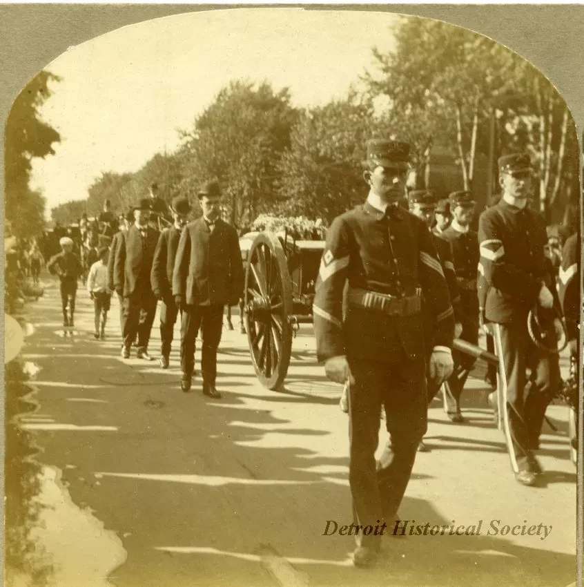 Sepia-toned stereoscopic photo card of Hazen S. Pingree's funeral procession, on July 6. 1901. Uniformed Soldiers stand in the front of his coffin as it is wheeled down the street. Men in suits walk at the side of the wagon. Men on horseback are in the background. "A.J. Doughty, Detroit" are printed on the left edge of the card.