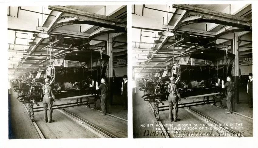 Black and white stereoscopic card containing photos of men handling final assembly of a Hudson Super-Six's body on the assembly line at the Hudson Motor Car Company. Under the right view is the caption, "No B17 Mounting Hudson Super-Six Bodies In The / Final Assembly Room Of The Hudson Motor / Car Company / Hudson Motor Car Co, Detroit, USA" in typed white text. The card was produced by The Corte-Scope Company out of Cleveland, Ohio.