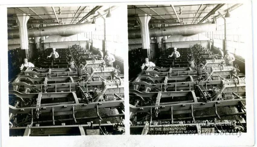 Black and white stereoscopic card containing photos of men varnishing chassis at the Hudson Motor Car Company. Under the right view is the caption, "No B8 Varnishing Chassis In Factory Of The Hudson / Motor Car Company; Note Large Drying Ovens / In The Background / Hudson Motor Car Co, Detroit, USA" in typed white text. The card was produced by The Corte-Scope Company out of Cleveland, Ohio.