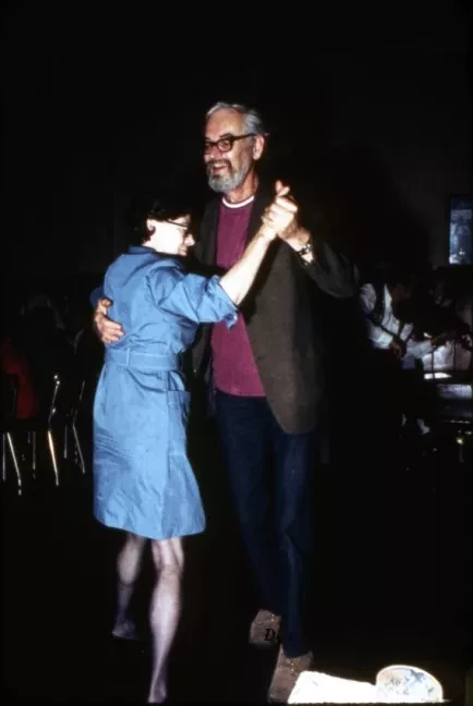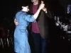 Color photographic slide depicting a man in a brown suit coat and jeans dancing with a woman in a blue dress inside of Kovacs Bar. Musicians in folk costumes and seated patrons are visible in the background.