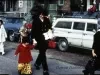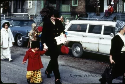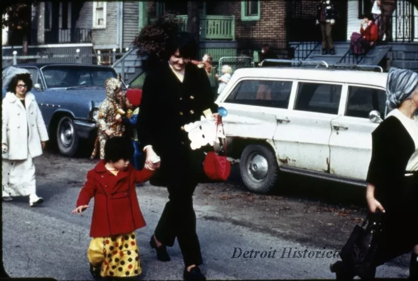 Color photographic slide taken of a woman in a dark coat holding hand of a child wearing a coat over a Halloween costume consisting of a long yellow smock with red and blue polka dots. The pair walk along the center of the street beside a row of parked cars. The woman holds the child's mask, which appears to be Lady Liberty from the Ben Cooper costume line. Other children in costumes and another adult are also in view.