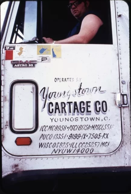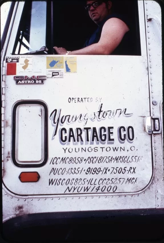 Color photographic slide depicting a man driving a GMC Astro 95 labeled "Operated by Youngstown Cartage Co. Youngstown O."