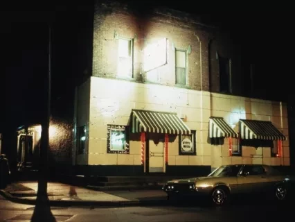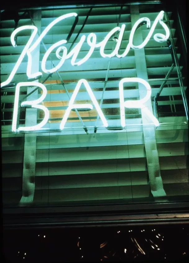 Color photographic slide depicting a neon sign that reads "Kovacs Bar", located at 6986 W Jefferson Avenue in Delray.