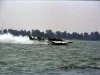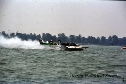 Color slide, taken during the 1978 Spirit of Detroit Race, of OH BOY! OBERTO (foreground), driven by Bob Maschmedt, with PAT O'GRADY'S LAKESHORE, driven by Terry Turner, behind him. Neither boat qualified for the race.