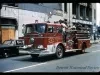Color 35mm slide of a photo taken during the unrest of 1967 by Detroit Fire Department photographer Capt. Joseph A. Mancinelli. The image shows a Madison Heights Fire Department firetruck on Grand River Avenue. Several firefighters in t-shirts and helmets ride on the rear of the truck along with members of the Michigan National Guard. Nickies Furniture stands in the background, its exterior blackened from fire.