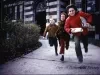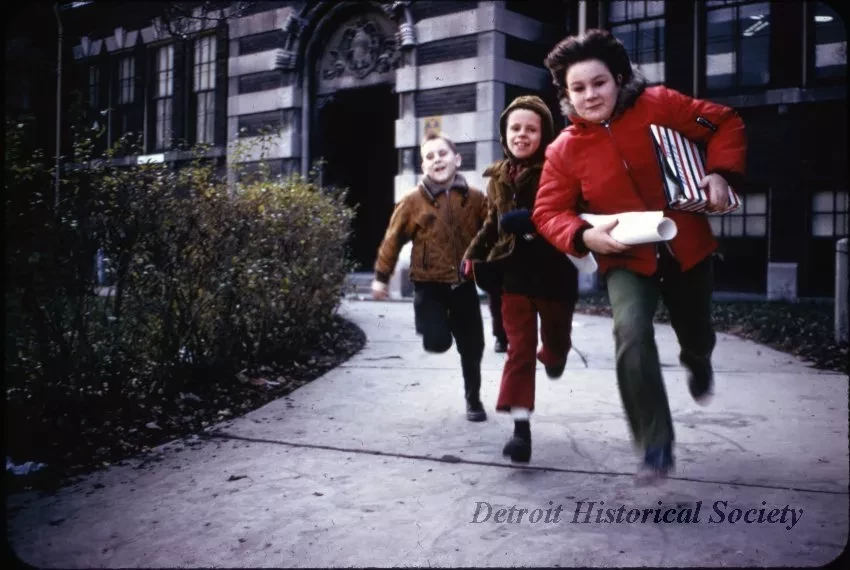Color photographic slide depicting three children running along the sidewalk in front of Morley Elementary School, located on Beaumont Street in Delray.