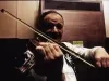 Request ImageColor photographic slide depicting a musician clad in a folk costume playing a violin in Kovacs Bar, with an air conditioner in the background.