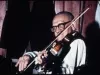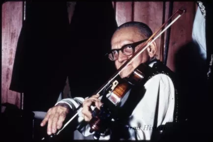 Color photographic slide depicting a musician clad in a folk costume playing a violin at Kovacs Bar with a jacket hung on a wood paneled wall in the background.