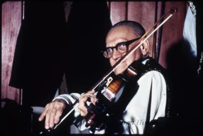 Request ImageColor photographic slide depicting a musician clad in a folk costume playing a violin at Kovacs Bar with a jacket hung on a wood paneled wall in the background.