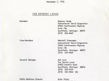 Keywords Content Type All TypesArchiveObjectPhoto Collection Name Object Name Description Title People Creator Catalog Number Advanced Search You searched for "Tennis" 55 Results Found Program 2005.055.007Archive World Team Tennis View Artifact Program 2005.055.004Archive World Team Tennis View Artifact Program 2005.055.008Archive World Team Tennis View Artifact Program 2005.055.006Archive World Team Tennis View Artifact Program 2005.055.005Archive World Team Tennis View Artifact Program 2005.055.003Archive World Team Tennis View Artifact Program 2005.055.002Archive World Team Tennis View Artifact Magazine 2005.055.001Archive The American Way, Vol. 6, No. 8, August 1973 View Artifact Magazine 2005.055.009Archive Northliner Magazine, Vol. 5, No. 2, Spring 1974 View Artifact Card, Business 2014.003.207Archive View Artifact Release, News 2014.003.206Archive View Artifact Print, Photographic 2002.021.014Photo View Artifact Pagination Current page 1 Page 2 Page 3 Page 4 Page 5 Next page Plan Your Visit Get information about hours, location, admission, and more! Explore History Uncover stories of innovation, culture, and Detroit’s transformative journey.