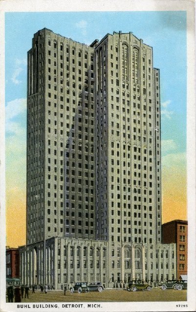 In the 1920s, a third generation of Buhls decided to make more profitable use of their prime downtown land by replacing their small office building at Griswold and West Congress with the current 26-story building. Wirt Rowland of the Smith, Hinchman and Grylls architectural firm, and designer of the Guardian Building, was selected as the architect. He created a beautiful neo-Gothic structure with Romanesque accents including ram's heads, acanthus leaves, basket weaving, and elaborate laurel and floral work as well as the magnificent carved Native American figures sculpted by Corrado Parducci.