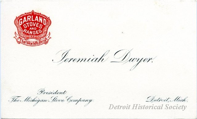 Before Detroit was the Motor City, it was the largest manufacturer of stoves in the world. Much of this success was because of brothers Jeremiah and James Dwyer. Jeremiah, the elder of the two, was born August 22, 1838 in Brooklyn, N.Y. and came to Springwells, outside Detroit, with his family. Forced to work at a young age because of the death of his father, Jeremiah was an apprentice and journeyman at several foundries before winding up as a foreman at Geary & Russel. With the knowledge he gained, he and his younger brother James formed the J. Dwyer & Company foundry in 1861, making the first stove in Michigan.