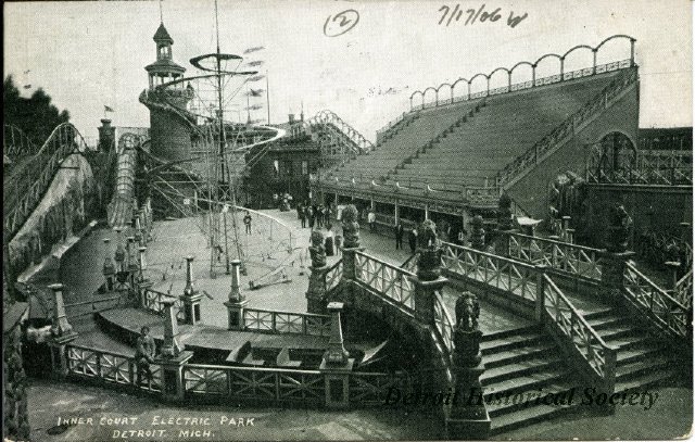 Owned by Arthur Gaulker and family, Electric Park was an amusement park in Detroit from 1906 to 1928, located at the entrance to Belle Isle in what is now Gabriel Richard Park. Electric Park went through numerous name changes including: Luna Park, Riverview Park, and Granada Park. Originally a trolley park at the end of three streetcar lines, the park contained a large windmill at the entrance with a sign that read, “The Boardwalk: Just for Fun.”