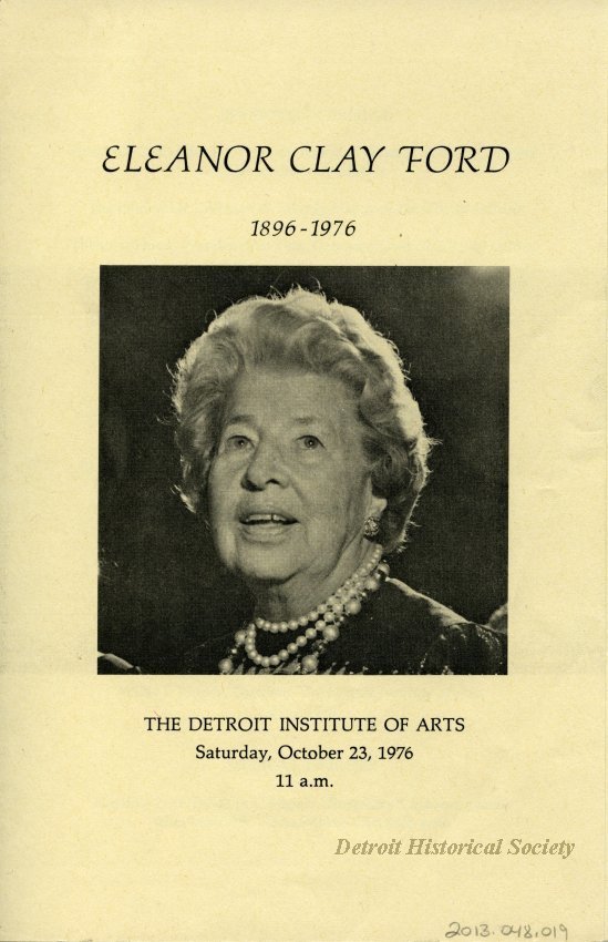 Eleanor Clay Ford contributed greatly to the cultural community of Detroit. Not only was the house that she lived in with her husband, Edsel Ford and their four children, left intact with an endowment “for the benefit of the public,” but the Detroit Institute of Arts (DIA) was a principle recipient of her beneficence.