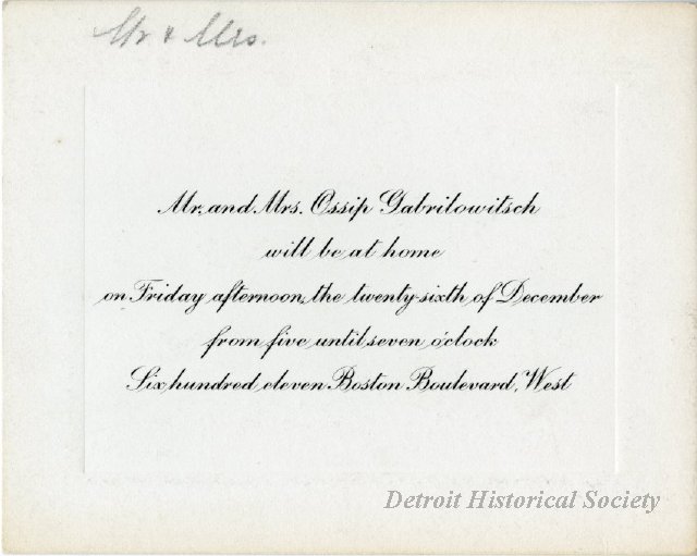 Gabrilowitsch and Clara were involved with high society life in Detroit, and experienced the city during one of its most exciting and prosperous eras. On September 14, 1936, Gabrilowitsch died from stomach cancer.