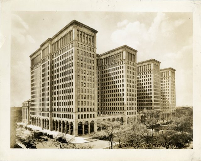 When it opened in 1923, it was the second largest office building in the world, in capacity. Designed in a neo-classical architectural style rising fifteen stories, it is 220 feet tall. The façade of the building was constructed in limestone, crowned with a two-story Corinthian colonnade. The base of the building is two stories tall with four parallel fifteen-story wings designed to allow sunlight to reach each of the hundreds of individual offices in the building.