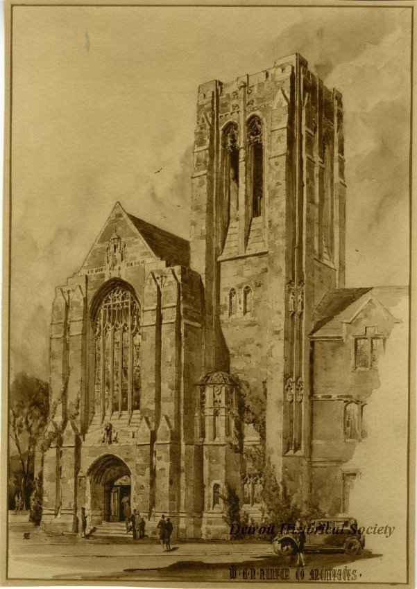 Architect W.E.N. Hunter of Detroit designed the varicolored granite and limestone building in the 16th Century Pier and Clerestory Gothic style. Eleven bells, made and installed by John Taylor of Lestershire, England, are housed in the 104-foot Luther Tower.