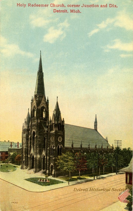 On St. Patrick’s Day, 1880, The Redemptorist Fathers founded Holy Redeemer Parish to serve the Irish and German Catholics living in the area that was then known as Springwells. The first services were held in a general store on West Jefferson Avenue. In September of 1880, four acres of land on the corner of Vernor and Junction Streets were purchased to construct a church building. The wood frame structure known as the Little Church on Sand Hill was dedicated in 1881. In 1882, a school was established under the leadership of the Immaculate Heart of Mary (IHM) Sisters.