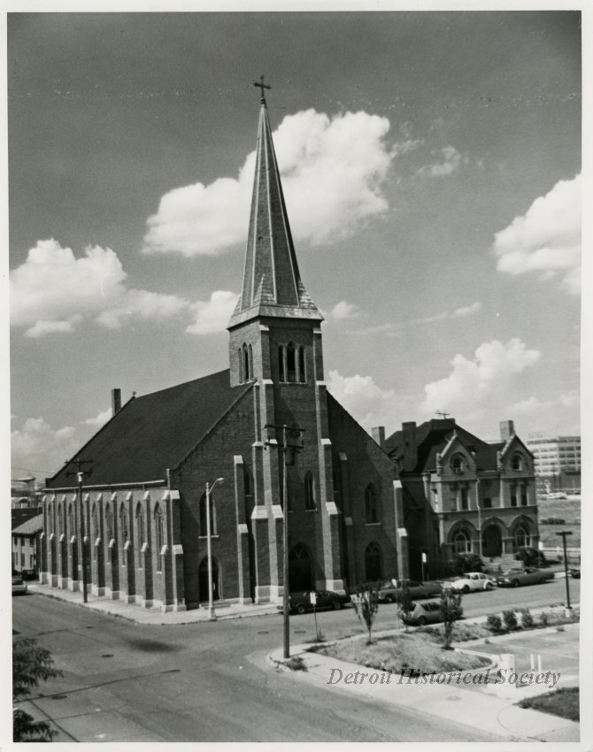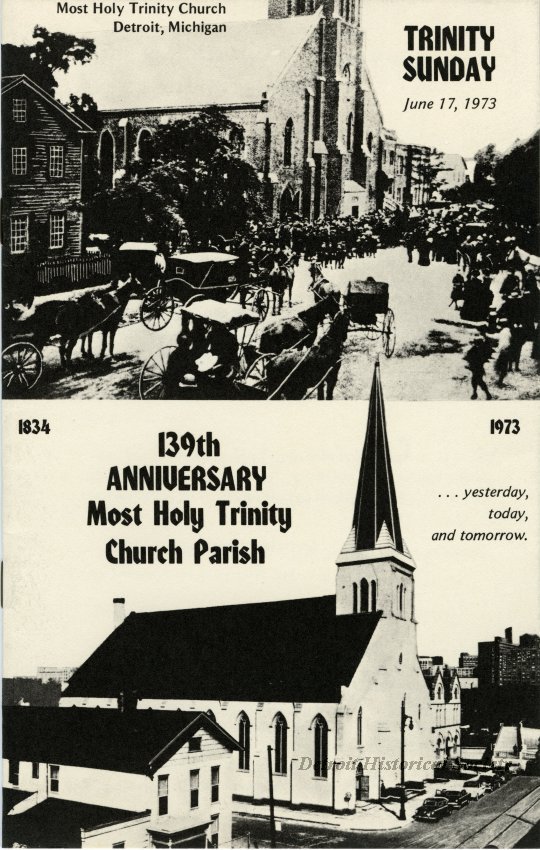 Founded in 1834, Most Holy Trinity was the first English-language Roman Catholic parish in Detroit. The earliest parishioners of the church were Irish immigrants who had settled in the Corktown area. The new parish purchased the wooden meetinghouse of the First Protestant Society at Woodward Avenue and Larned Street. It was carefully deconstructed and rebuilt at the corner of Bates Street and Michigan Avenue. Before the first service could be held, the national cholera epidemic of 1834 struck, and the little church was transformed into a hospital, making it the first hospital in Detroit. A small memorial in the rear of the nave shows some artifacts from the clinic. Dedication of the church was on Trinity Sunday, June 14, 1835. A parish school was established on August 30, 1837, making it one of the oldest continuously-operated Catholic schools in the country.