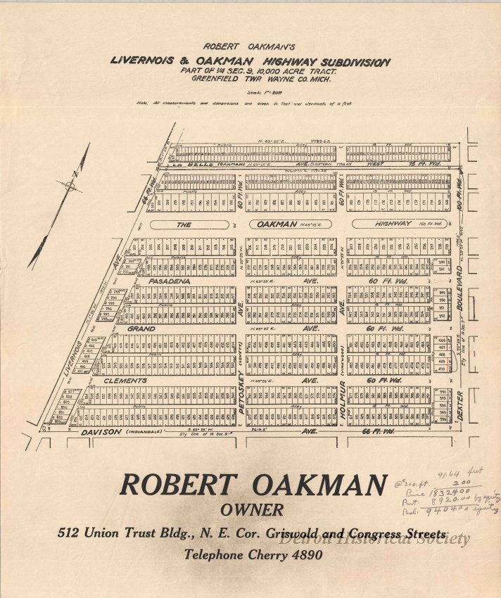 Named for master land developer and realtor, Robert Oakman, Oakman Boulevard was purchased as a tract of land awaiting development in 1908. With the automobile industry growing and more vehicles being produced there weren’t many roads on which the vehicles could travel safely. Oakman proposed a road similar to Grand Boulevard; it would travel in a horseshoe, allowing drivers to see opposite sides of the city as well as beautifully built homes. Oakman’s wife was Mamie Moross, daughter of Joseph Moross, builder of Grand Boulevard.