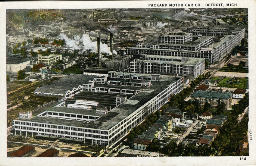 In 1902 the name of the business was changed to the Packard Motor Car Company, and it moved to Detroit the next year. Architect Albert Kahn was hired to design the factory on East Grand Boulevard, that would start with ten buildings and expand to a complex of 40. This initiated Kahn’s notable career as a factory architect using reinforced concrete, allowing him to design, as exemplified in Packard Factory Building No. 10, the window-filled, wide-open areas that would be the hallmark of factories for years to come.