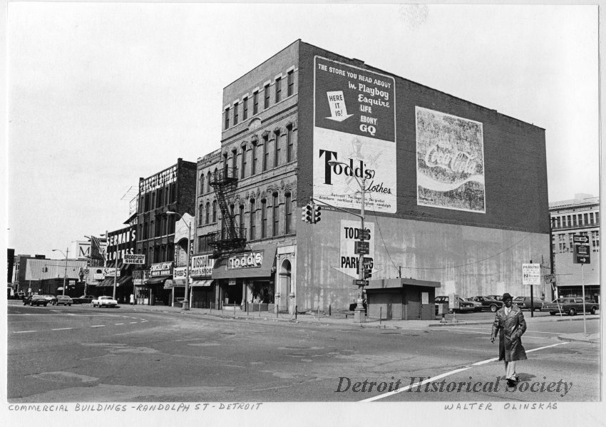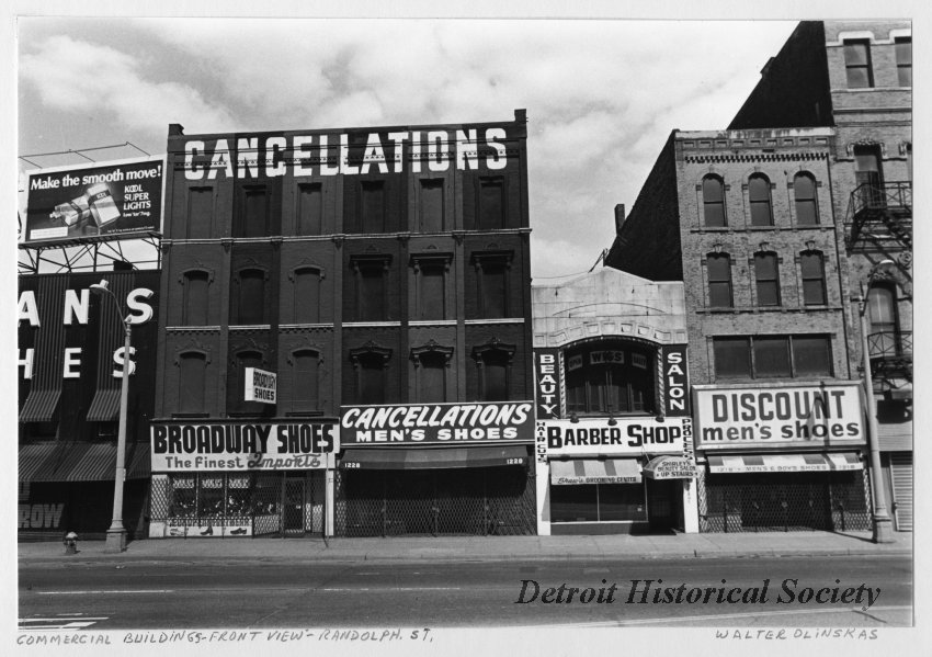 The commercial buildings on Randolph Street flourished as a shopping district into the 20th century, housing numerous commercial enterprises over the years including legal offices and shops for tailors, jewelers, printers, druggists, publishers, artists, and sculptors. By the early 1900s, the District was largely composed of dry goods and clothing establishments, which still engaged in the old-fashioned practice of bartering within the clothing and shoe stores rather than setting fixed prices. Today, the area is adjacent to the Greektown district, and most of the buildings house street level bars or restaurants, with the upper floors of the buildings remaining unoccupied. The last remaining clothing establishment, Serman’s, at 1238 Randolph, closed in 2013 after 96 years in business. The building was acquired by Rock Ventures LLC in 2013.