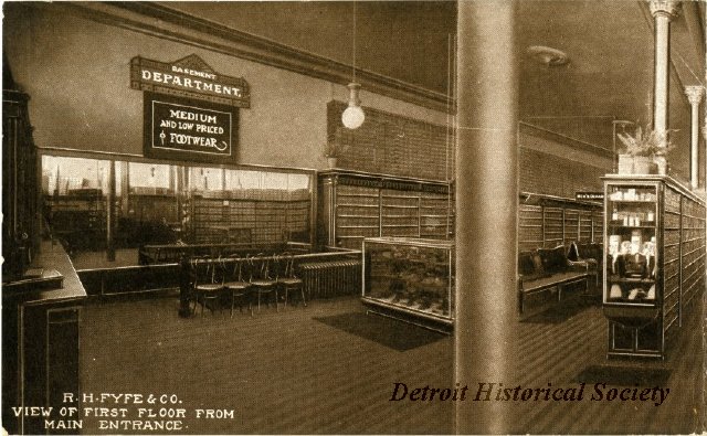 Richard Henry Fyfe founded his shoe company in 1865 at age 26, moving his store several times along Woodward Avenue. In 1919, his new “Temple of Shoes” opened at West Adams Avenue and Woodward. Famed Detroit architects Smith, Hinchman and Grylls designed a neo-gothic emporium that encompassed ten floors, four mezzanines, and two basements, making Fyfe’s the world’s largest retail shoe store. It also had the moniker of “Shoe Skyscraper.”