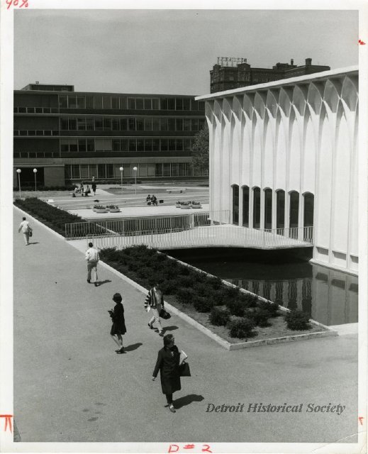 In 1945, Yamasaki moved to Detroit, Michigan. He was hired by the firm of Smith, Hinchman, and Grylls as their head designer where he remained until 1949. Among his achievements there were the design of the addition to Detroit’s Federal Reserve Bank (1946), and the administration building at the General Motors Proving Ground (1950). Because restrictive covenants prevented him from renting or buying property in many metro-Detroit communities, he eventually settled with his family on a 7.5-acre farmstead in Troy, Michigan, where they remained for 25 years.